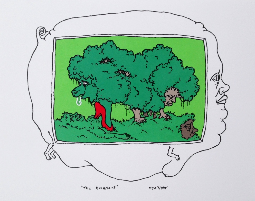 “The Occupant” – Original painting by MJ Seal. Sepia ink on cotton rag paper, 5″ x 3″, C. 2014“The Occupant”- Original painting by MJ Seal. Acrylic on cotton rag paper, 14″ x 11″. C. 2015This piece seems vaguely allegorical- perhaps of the inner turmoil of a fetishist.A fetid inner world hides behind a bland, black and white front.Anthropomorphic vegetation in a sour green atmosphere forms “The Occupant”