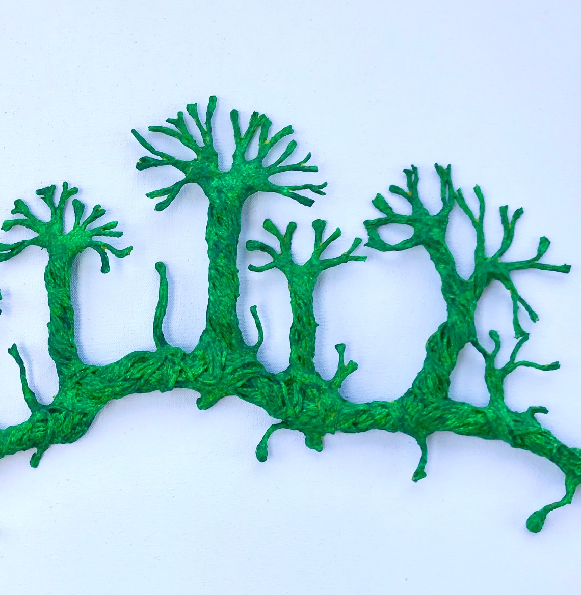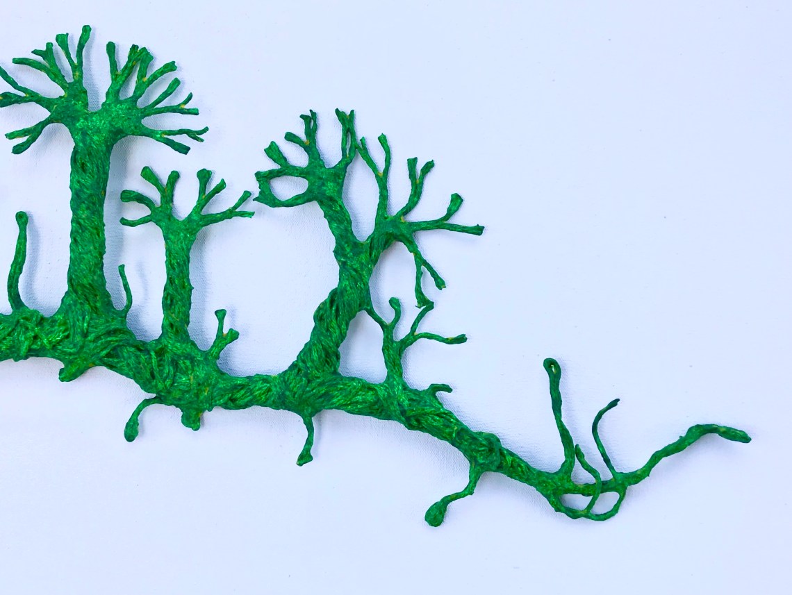 “Primitive Forest”- Original sculpture by MJ Seal. Cotton thread, paper mache and PVA glue with acrylic paint. 24″ x 11″