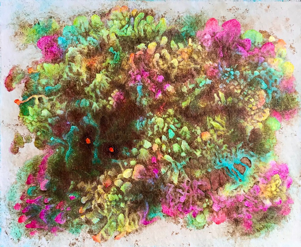 With some Titanium White and additional glazes of Raw Umber this forest turned into a mass of fungal forms-