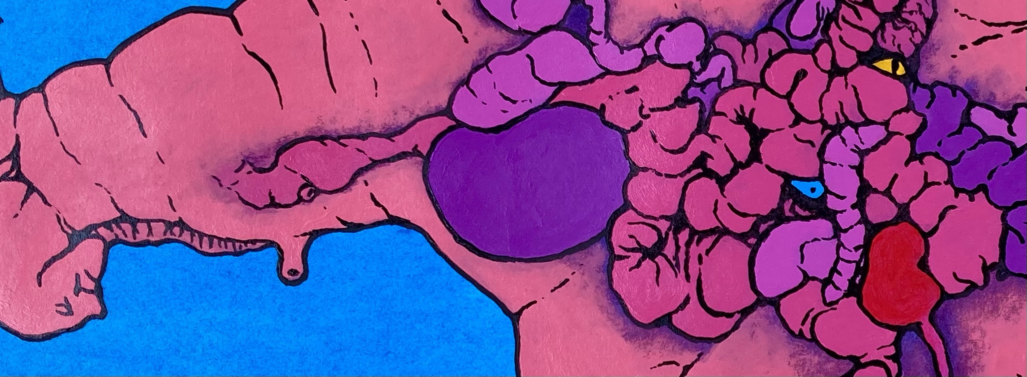 “Ravenous Creature “- Original painting by MJ Seal. Acrylic on Stonehenge paper, 26” x 20”. C. 2022The starting point for this was a sepia ink Blotograph I did years agoIt developed into this voracious pink mass Of hungry mouths and eyesGrasping handsAnd gurgling innardsIt has a kind of cutaway effect-Like a medical diagram