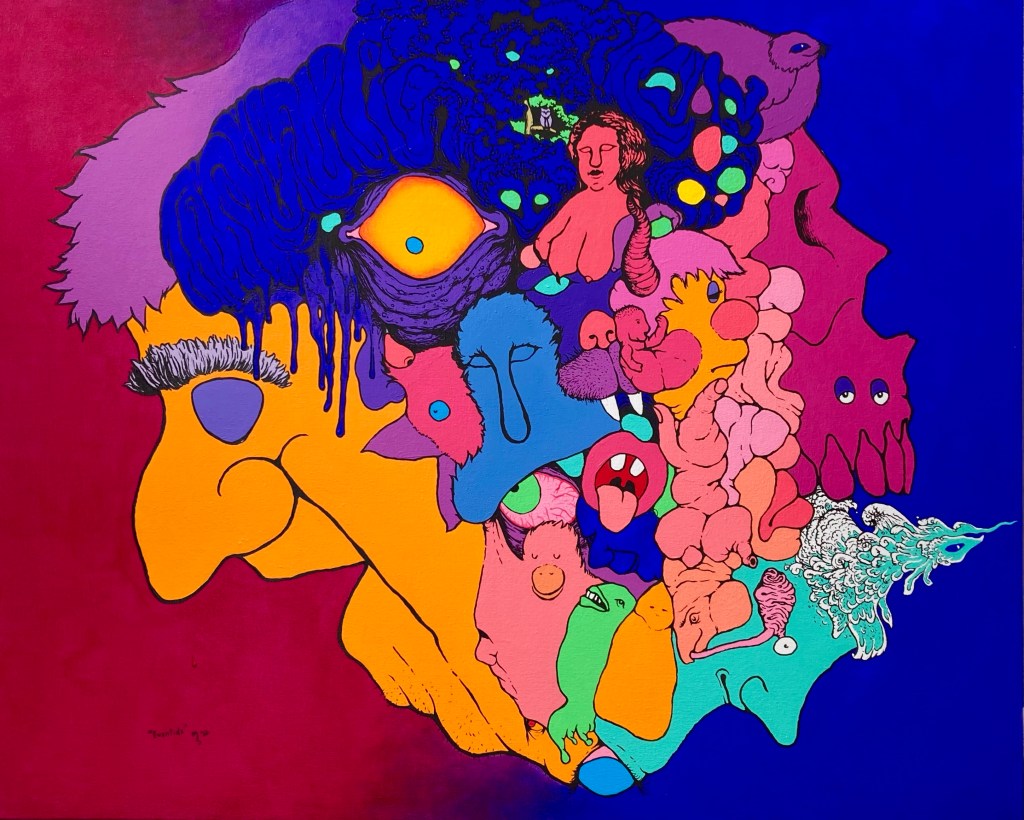Detail of an original cartoonish surreal acrylic painting by MJ Seal titled Eventide