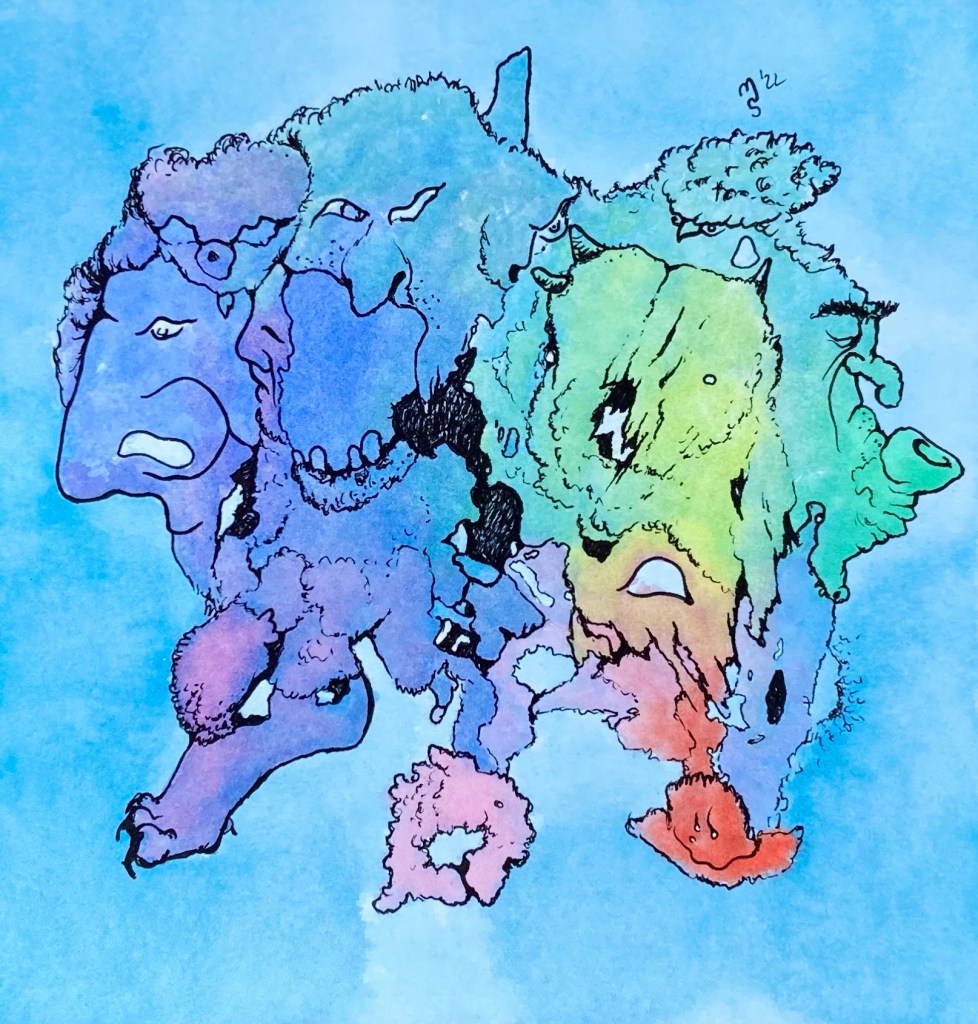 “Blotograph 081422”- Original drawing and painting by MJ Seal. Watercolor and ink on Stonehenge paper, 8” x 8”. C. 2022