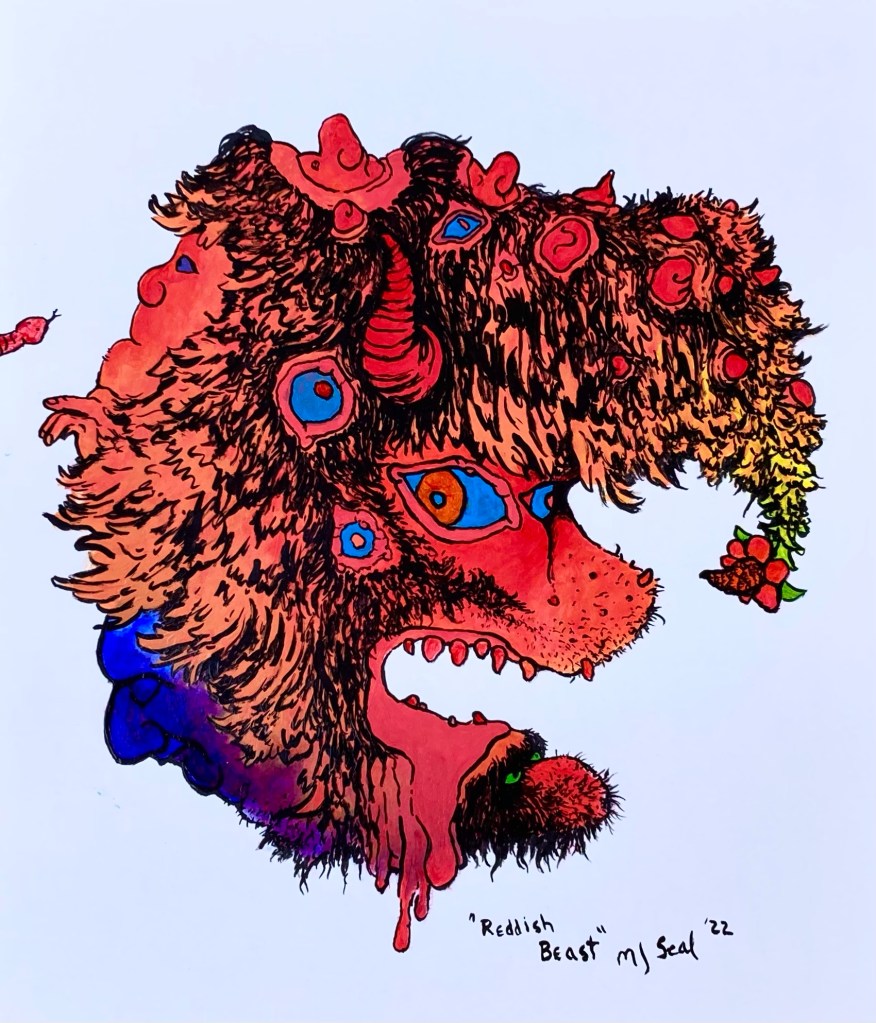 Reddish Beast “Reddish Beast”- Original painting by MJ Seal. Acrylic on paper, 17” x 20”. C. 2022 Share this: Click to share on X (Opens in new window) X Click to share on Facebook (Opens in new window) Facebook Like Loading...